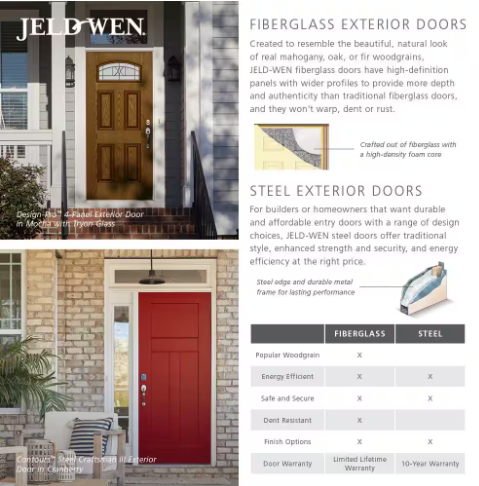 JELD-WEN Premium Steel doors offer reliable strength, durability and easy maintenance to complement your home’s style. Their high-definition panels create an upscale look that adds architectural interest for increased curb appeal. The strong and secure steel doors are designed to prevent water absorption and resist rust to enhance your home for many years.