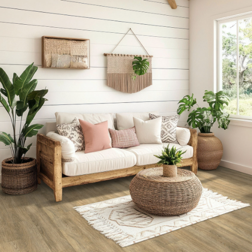 Ayla Luxury Vinyl Planks infuse any space with warm, inviting charm, featuring a stunning dirty blonde hue with rich, contrasting knots and grains for a natural, sophisticated look. Designed for ultimate convenience, this premium glue down vinyl flooring boasts zero acclimation technology, allowing for seamless, same-day purchase and installation. The durable 7” x 48” planks are water-resistant and reinforced with Okanhahomedepot exclusive CrystaLux protection layer, ensuring exceptional longevity and resistance to scratches, spills, and daily wear. Backed by a 25-year limited residential warranty and a 6-year limited light commercial warranty, Ayla is GREENGUARD Gold, Floor Score, and LEED certified—making it a safer, more sustainable choice for any environment. Ayla is a versatile, low-maintenance option suitable for all floor levels, including basements. Perfect for kitchens, living areas, and bathrooms, this affordable yet stylish flooring delivers timeless elegance with unbeatable performance. Matching trim pieces are available, including stair noses, reducers, and T-molding.