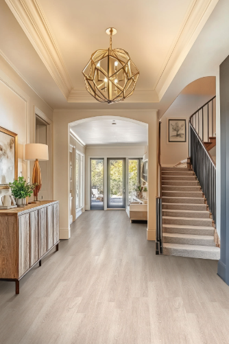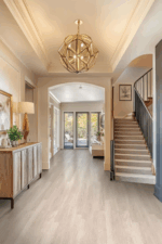 Wharton Luxury Vinyl Planks offer a perfect blend of warmth and durability with a soft sandy blonde hue accented by natural knots and grains for a timeless look. Designed for easy installation, this premium gluedown vinyl flooring features zero acclimation technology, allowing for same-day purchase and setup. The resilient 7” x 48” planks are water-resistant and protected by exclusive CrystaLux layer, ensuring long-lasting defense against scratches, spills, and daily wear. Backed by a 25-year limited residential warranty and a 6-year limited light commercial warranty, Wharton is GREENGUARD Gold, FloorScore, and LEED certified—offering a sustainable and safe flooring solution. Wharton is a versatile, low-maintenance choice suitable for all floor levels, including basements. Ideal for kitchens, living areas, and bathrooms, this stylish yet affordable flooring delivers both beauty and performance. Matching trim pieces are available, including stair noses, reducers, and T-molding.