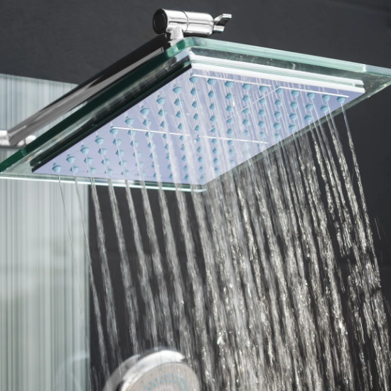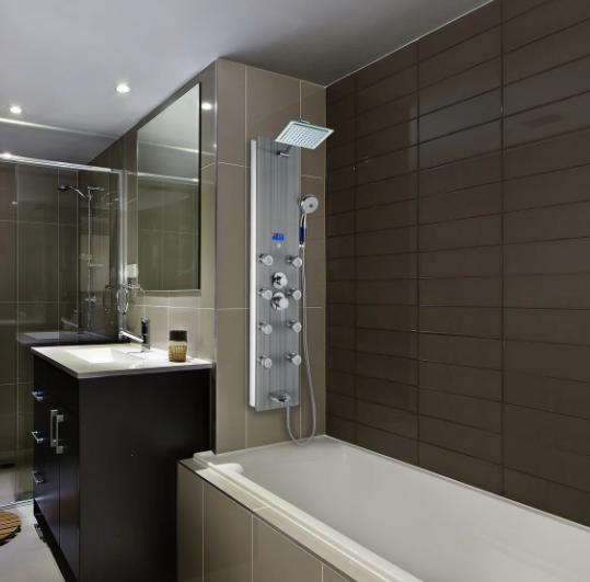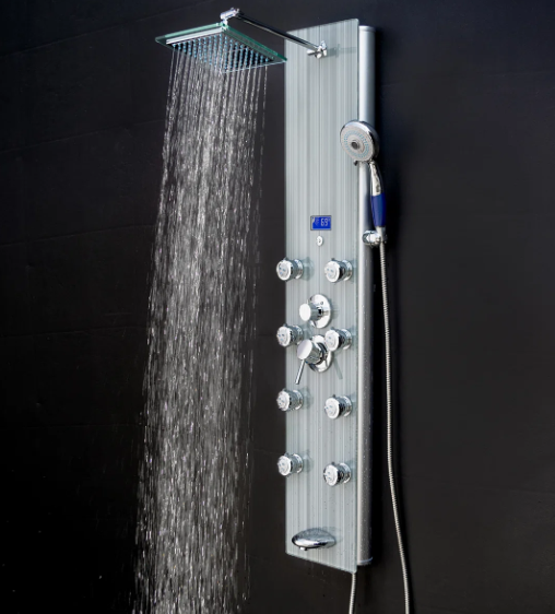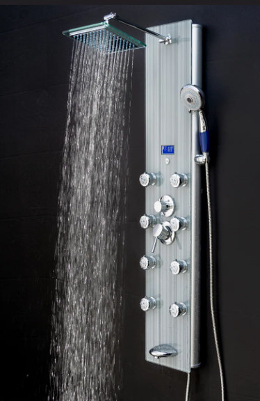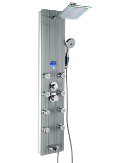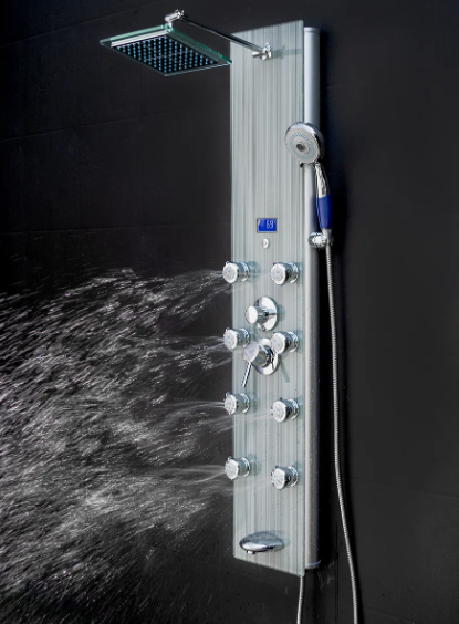 This shower panel has massage body jets, a handheld wand, a tub filler, and a rainfall showerhead, this shower panel has all the bells and whistles a modern bathroom needs. An LED display always shows the current temperature for added convenience and a more tailored shower. Its beautiful tempered glass overlay design brings a modern and sophisticated look to your bathroom renovation.