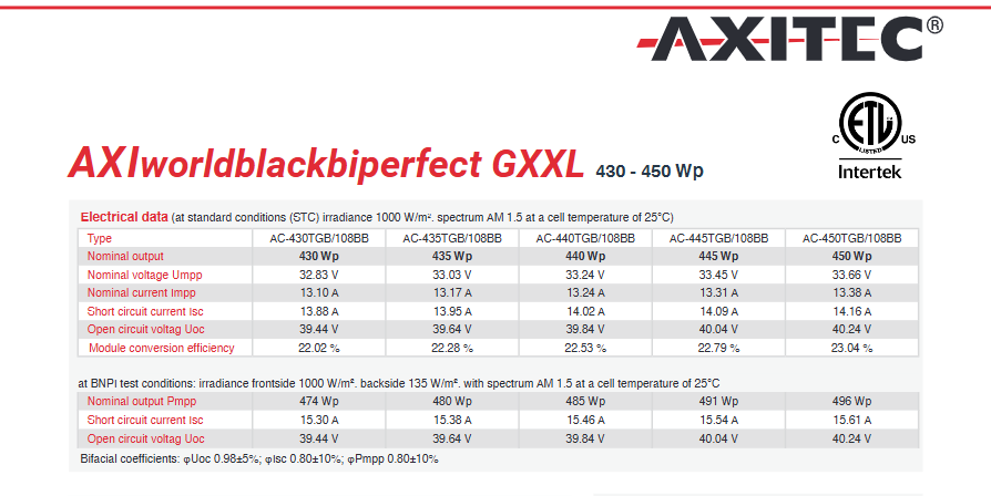 Axitec AC-440TGB/108BB-PT Bifacial Solar Panel Pallet, 36ea Min Purchase, 440W, AXIworldblackbiperfect GXXL Series, MC4-EVO 2A, 30mm Black Frame, All-Black, 108 N-Type TOPCon Mono, Double Glass, 30A Fuse, 1500VDC