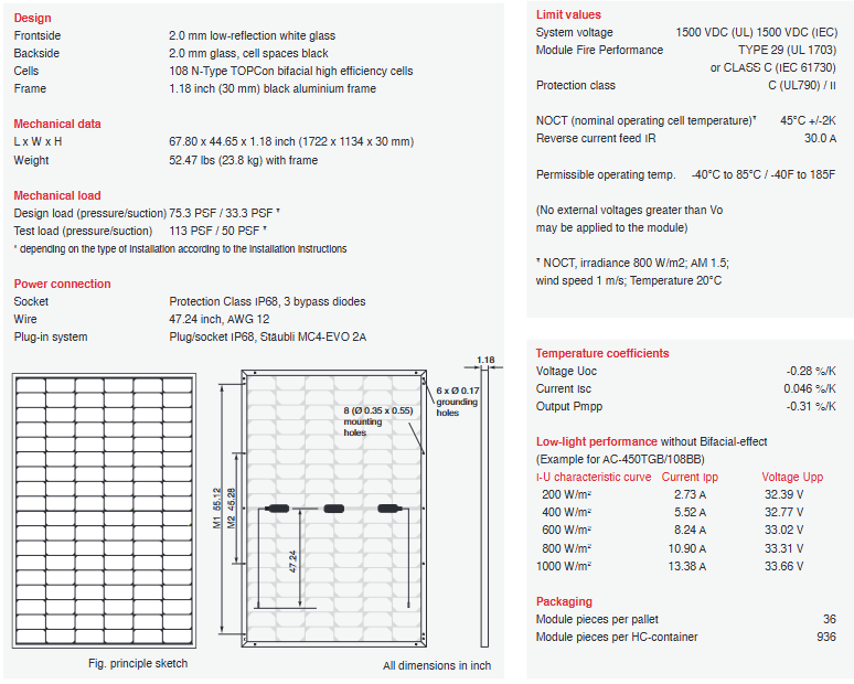 | Power Connection | Socket Protection Class: IP68, 3 bypass diodes Wire: 47.24 inch, AWG 12 Plug-in system: Plug/socket IP68, Stäubli MC4-EVO 2A |