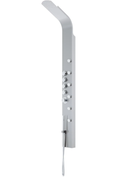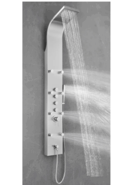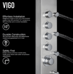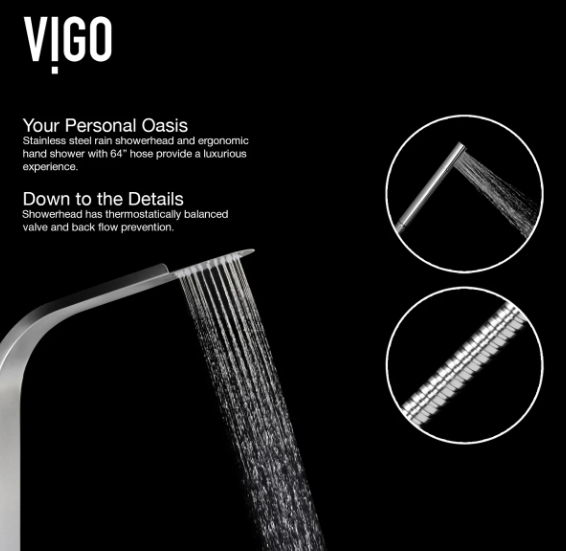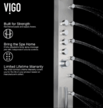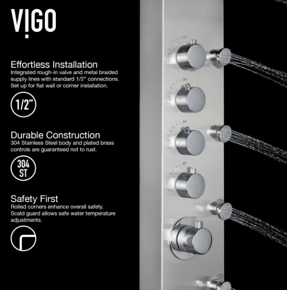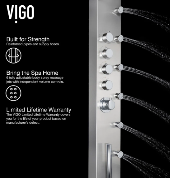 Elevate your shower experience with the stylish Brielle The High-Pressure 6 -Jet shower panel. This luxurious unit combines various spa-inspired features for a truly rejuvenating experience. Enjoy the soothing massage jets that ease muscle tension and stress, and a rainfall shower that mimics gentle rain for full-body coverage. Easily switch between functions with the intuitive knob for a personalized shower. Safety is ensured with a valve that maintains a consistent water temperature, making it ideal for all ages. The flexible handheld shower is perfect for reaching difficult areas, bathing pets, or assisting loved ones. Crafted from durable materials, this shower panel adds a modern touch to any bathroom and features self-cleaning nozzles for easy maintenance. Transform your shower into a personal spa oasis with this elegant and functional shower panel designed by VIGO.