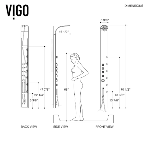 | Shower Head | 6'' W X 17'' L | Panel | 68'' H |