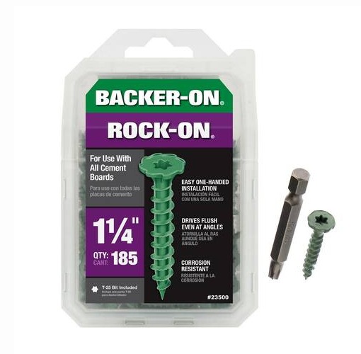 Backer-On Rock-On 1-1/4 in. cement board screws (185 pack) are the top choice for securing cement boards. The unique serrated head countersinks to sit flush at any angle, ensuring a smooth surface for tiling. The star drive recess allows for easy one-handed installation and prevents cam outs. The high-quality corrosion-resistant finish stops rust from seeping into grout, making these screws ideal for damp areas like bathrooms and kitchens.