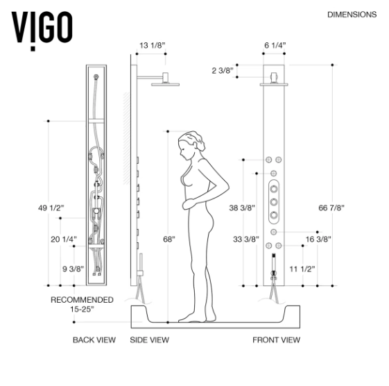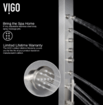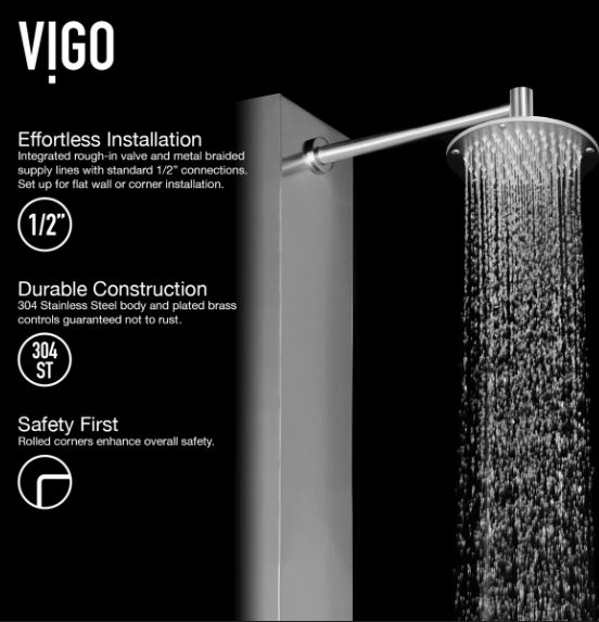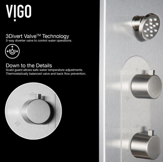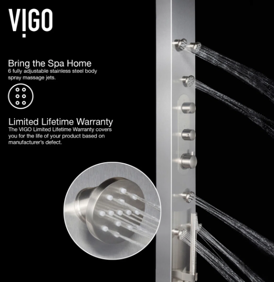 Elevate your shower experience with the stylish Dilana High-Pressure 6-Jet shower panel. This luxurious unit combines various spa-inspired features for a truly rejuvenating experience. Enjoy the soothing massage jets that ease muscle tension and stress, and a rainfall shower that mimics gentle rain for full-body coverage. Easily switch between functions with the intuitive knob for a personalized shower. Safety is ensured with a valve that maintains a consistent water temperature, making it ideal for all ages. The flexible handheld shower is perfect for reaching difficult areas, bathing pets, or assisting loved ones. Crafted from durable materials, this shower panel adds a modern touch to any bathroom and features self-cleaning nozzles for easy maintenance. Transform your shower into a personal spa oasis with this elegant and functional shower panel designed by VIGO.