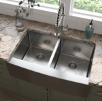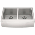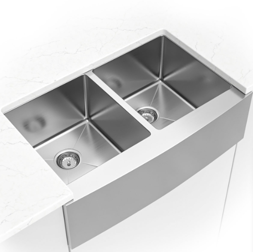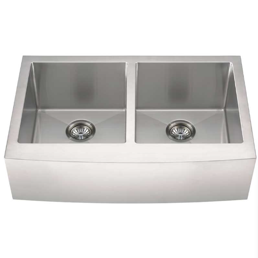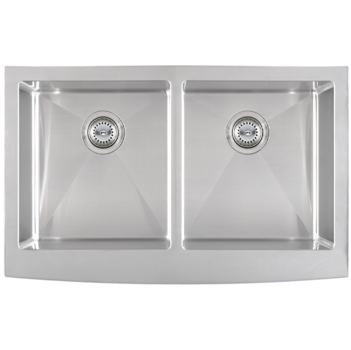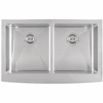 This handcrafted double basin undermount sink features a beautiful curved apron for that sought-after finished look. Constructed with 16-gauge stainless steel for reliable durability, it offers two equally sized deep basins (10” each). Big family dinners? No problem. This hardworking sink can handle oversized cookware like stockpots, slow cookers, and baking sheets. An ideal choice for busy homes and light commercial environments, this sink includes innovative sound shielding pads to help improve the washing experience. Its beautiful brushed satin finish makes clean-up a breeze and helps minimize water spots and small scratches. Long lasting quality and elegance come together in this popular double bowl aproned sink.