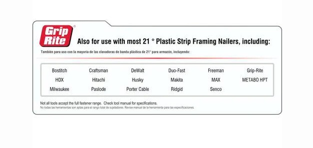 Grip-Rite GR024 3-1/4 in. x 0.131 in. 21° Plastic Collated Bright Coated Steel Smooth Shank Framing Nails are compatible with all 21° pneumatic nailers. Uncoated for easy, flush, or countersunk installation. All Grip-Rite collated nails are backed by the Grip-Rite Jam Free Guarantee. You’ll love how quickly you can complete framing projects with our best-selling fasteners.