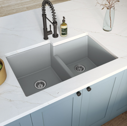 This sophisticated Gray Quartz Double Bowl undermount sink showcases scratch, stain, and germ resistance. It features a combination of one large and one smaller basin (60/40) to accommodate large cookware such as large stockpots and baking sheets, while also keeping everyday glasses and dishes separate and secure. Tailored for busy homes and light commercial environments, this quartz sink displays impressive heat resistance, and its robust construction ensures superior sound absorption. Its matte finish effectively minimizes water spots, while the UV protected surface safeguards against fading. This sought-after quartz sink seamlessly blends enduring quality with elegance. Furthermore, it is backed by a limited lifetime warranty, offering additional peace of mind.