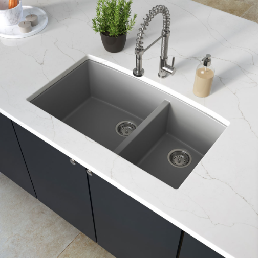 This gorgeous grey quartz double bowl undermount sink is scratch, stain, and germ resistant. With one large and one smaller basin (60/40), it accommodates your large cookware such as stockpots and baking sheets while keeping everyday glasses and dishes separate and safe. An ideal choice for busy homes and light commercial environments, this quartz sink is designed to be heat resistant up to 535 degrees Fahrenheit and its thick construction provides superior sound absorption. Its upscale velvety smooth matte finish helps minimize water spots and it features a UV protected surface to help resist fading. Long lasting quality and elegance come together in this popular double bowl quartz sink. Backed by a limited lifetime warranty.