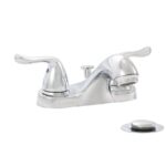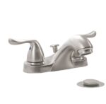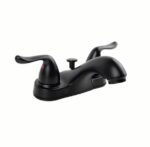 This classic, 4inch 2-handle centerset Bathroom Faucet features stylish curved handles. A brushed nickel, Matter Black, Chrome finish adds a modern flair that will smarten any residential bathroom. The faucet features a matching ABS Plastic pop-up drain, washerless cartridge, and 1.2 GPM rate, saving water.