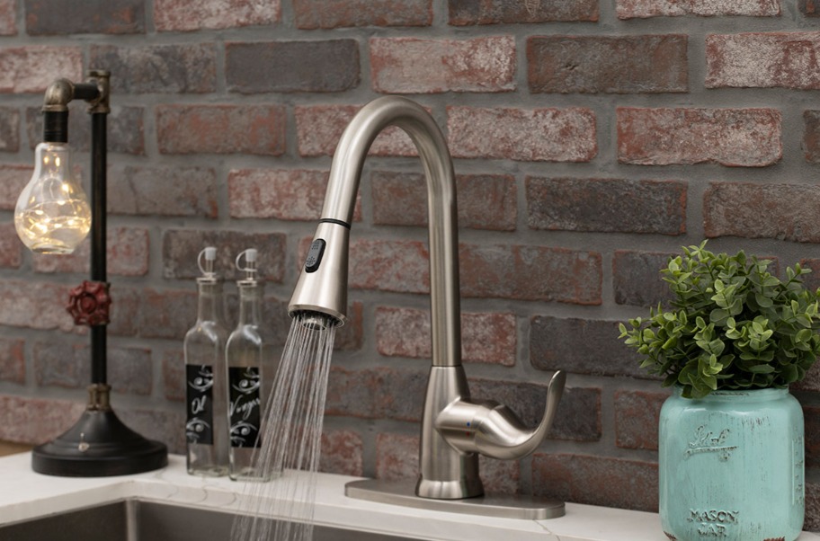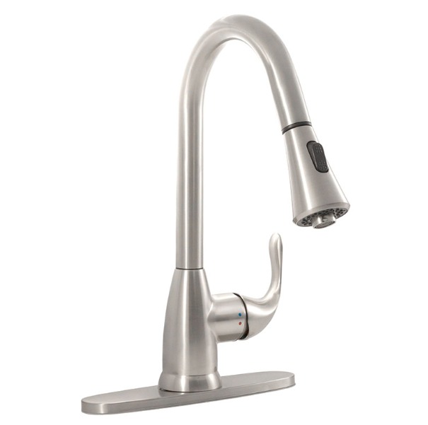 Featuring a beautiful nickel-brushed finish, the stylish 1-Handle Pull-Down Sprayer Kitchen Faucet adds range and flexibility to your kitchen sink area. The spray capability allows for a wider range of water reach to allow you to access harder to reach spots. The faucet is available with a matching deckplate to complete the look.