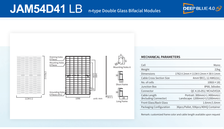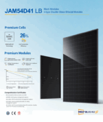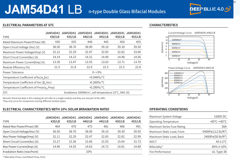 JA Solar’s JAM54D41-440/MB-PT Bifacial Solar Panel Pallet is powered by high-efficiency Mono-N-Type cells and the 16 busbar design helps improve low light performance. The half-cell configuration of the JAM54D41-440/MB-PT offers the advantages of higher power output, better temperature-dependent performance, reduced shading effect on the energy generation, lower risk of hot spot, as well as enhanced tolerance for mechanical loading. They also have a mid-mounted, split J-Box technology. The all-black construction also offers a very nice aesthetic for any project. The Bifacial gain can be up to 30% depending on ground reflectivity, array direction and temperature conditions.