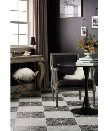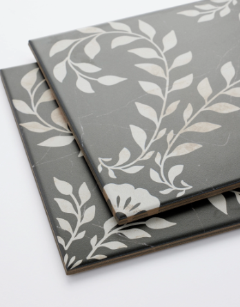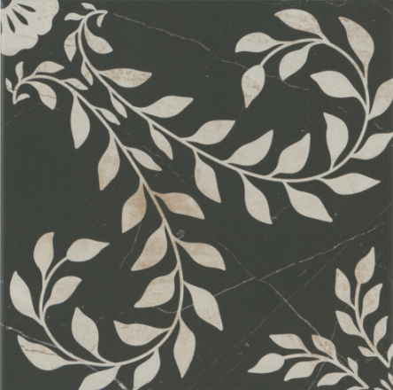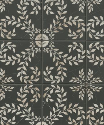 Embodying the celebrated designer’s signature classic, bold and whimsical style, the Kelli Fontana Inlay Proper Eden Ode porcelain wall and floor tile has a rich black marble-look background with a spiraling beige marble-look leaf and floral pattern that exudes ornate elegance and timeless femininity. Inspired by Kelli Fontana’s Bone Inlay wallpaper collection, this matte 8″ x 8″ tile is perfect for making a statement in smaller spaces, like a powder room or bar.