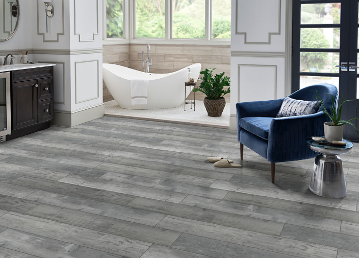 Achieve a vintage look in your environment with Kingsdown Gray® Luxury Vinyl Planks offering the perfect palette of soft grays with shading that evokes a weathered wood look reminiscent of the coast. This beautifully neutral-hued 7×48 wood-look LVP is 100% waterproof and protected with a 20 mil commercial-grade version of CrystaLux Ultra™, a protection layer that provides durability and longevity, protecting against everyday wear. It also comes with a custom-designed beveled edge, an innovative pre-attached backing to ensure supreme comfort underfoot and an easy-install locking system. This rigid core flooring features “no acclimation” technology that enables buy today, install today convenience. In the kitchen, living area, bathroom, basement and beyond, there’s no easier way to create luxurious, affordable floors in residential or commercial settings. A full range of vinyl flooring trims is available to give your project a professional finish. Andover products come with a lifetime limited residential, 15-year limited light commercial, and 10-year limited commercial warranty.