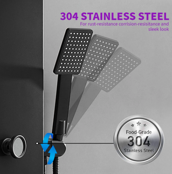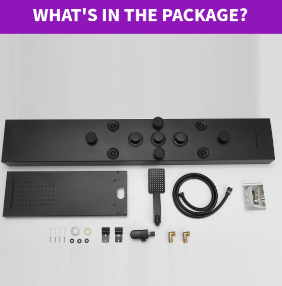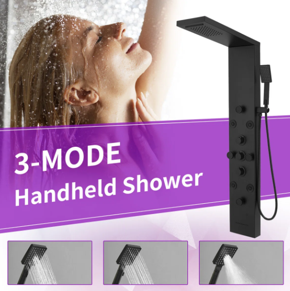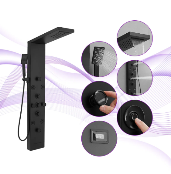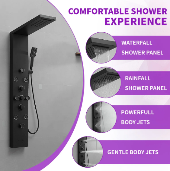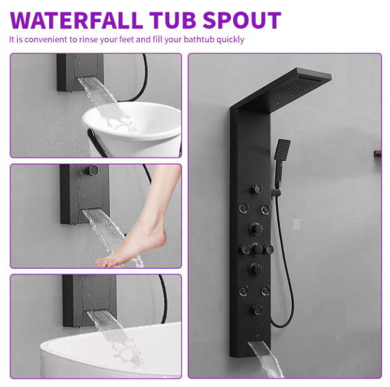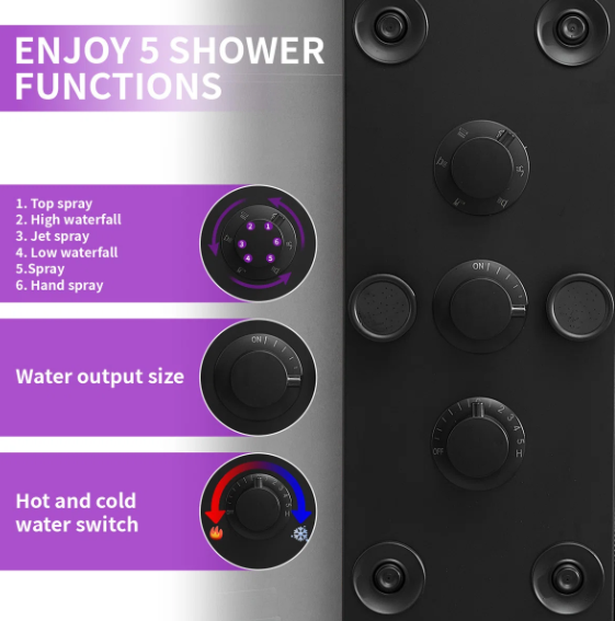 Multi Function Shower Panel System:Shower panel tower system works by Water Flow.Full body jets,rainfall shower head and temperature display, that assist you to select the best water temperature.Multi-outlet Switches which controls Multiple Combinations water effects, with Jets nozzles for Power Mist Massage and Handheld Shower Fixtures.This Split type shower panel include 6 functions: rainfall, waterfall, body Jets, handheld shower, tub spout, temperature display.
