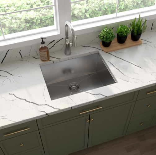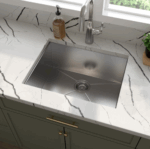 This handcrafted stainless-steel sink has a contemporary look that’s sure to earn compliments. Constructed with 16-gauge stainless steel for reliable durability, it offers one generously sized basin that’s 10” deep. An ideal choice for those who don’t want to sacrifice style for practicality, this sink is not only handsome, it includes sound shielding pads as well as a gorgeous muted finish that helps minimize water spots and small scratches. Long lasting quality and elegance come together in this popular sink.