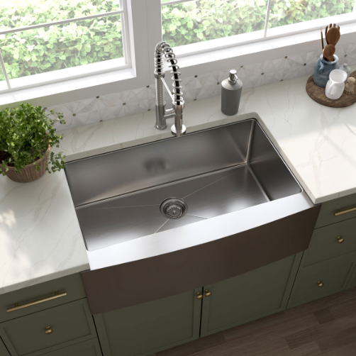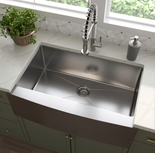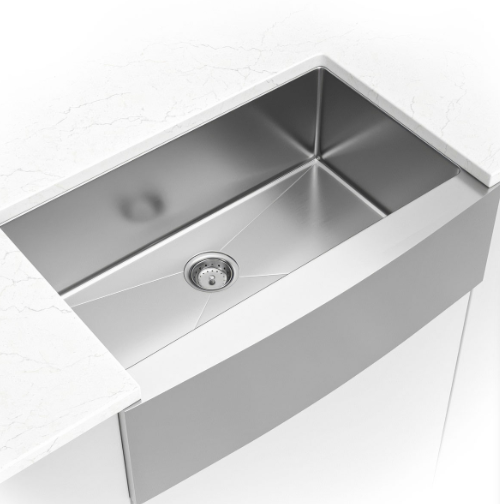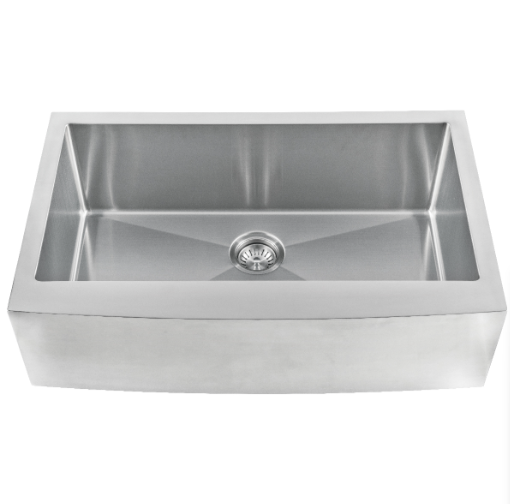 This handcrafted single bowl undermount sink features a slightly curved apron for that sought-after finished look. Constructed with 16-gauge stainless steel for reliable durability, it offers one generously sized basin that’s 10” deep. Big family dinners? No problem. This hardworking sink can handle oversized cookware like stockpots, slow cookers, and baking sheets. An ideal choice for busy homes and light commercial environments, this sink includes innovative sound shielding pads to help improve the washing experience. Its beautiful brushed satin finish makes clean-up a breeze and helps minimize water spots and small scratches. Long lasting quality and elegance come together in this popular large basin sink.