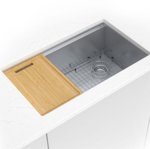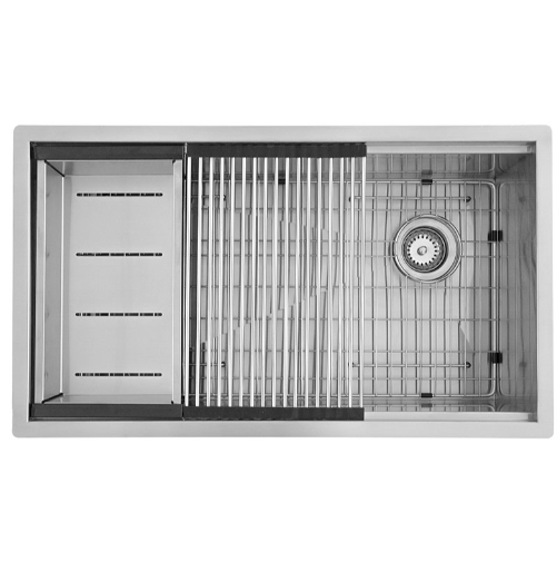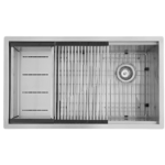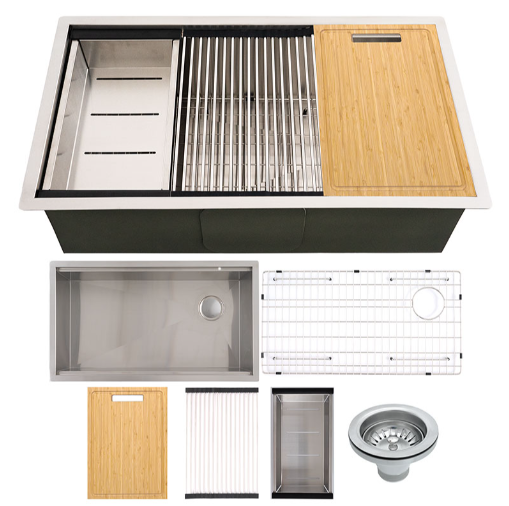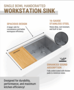 Upgrade your kitchen with this handcrafted undermount Workstation Sink, designed in a 33″ x 19″ x 10″ size and made from robust 16-gauge stainless steel with a sophisticated satin finish. The sink features a fully undercoated interior for enhanced sound absorption and includes a suite of practical accessories: a cutting board, colander, rolling mat, grid, and strainer. Each component can be used individually or together, offering maximum flexibility and functionality in your culinary space.