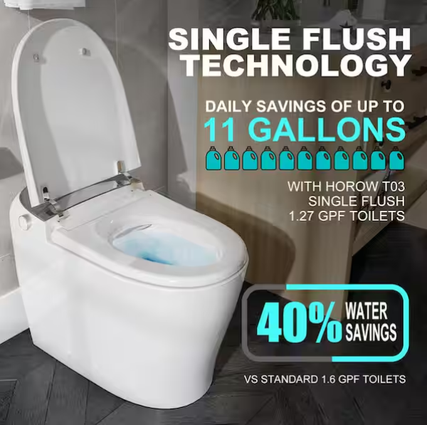 - Automatic Flush Toilet: When you stand from the toilet seat, the machine will send commands to control the flushing. Also, the flush can be controlled by a remote or knob. 1.27GPF